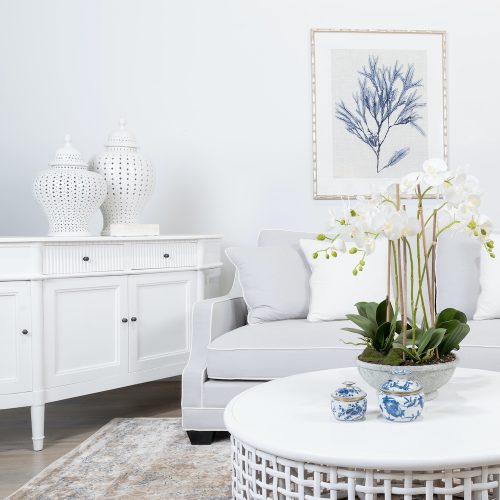 To bring a timeless Hamptons look to this beautiful holiday unit, we created stately, Hamptons-style two-pack cabinetry with a curved end that mirrors the architecture of the space and accentuates our custom curved-made boucle sofa. The cabinetry is tall enough to house Walter in style, while adding a refined, coastal charm that perfectly suits this luxury beachfront apartment.