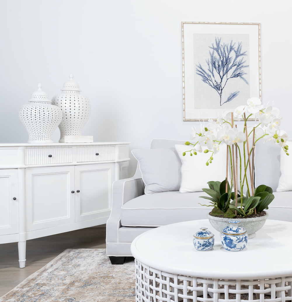 To bring a timeless Hamptons look to this beautiful holiday unit, we created stately, Hamptons-style two-pack cabinetry with a curved end that mirrors the architecture of the space and accentuates our custom curved-made boucle sofa. The cabinetry is tall enough to house Walter in style, while adding a refined, coastal charm that perfectly suits this luxury beachfront apartment.